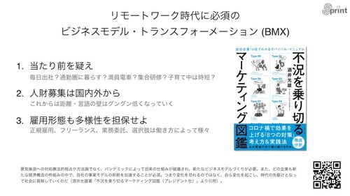 1)当たり前を疑え 毎日出社?通勤圏に暮らす?満員電車?集合研修?子育て中は時短? 2)人財募集は国内外から これからは距離・言語の壁はグングン低くなっていく 3)雇用形態も多様性を担保せよ 正規雇用、フリーランス、業務委託、選択肢は働き方によっ…